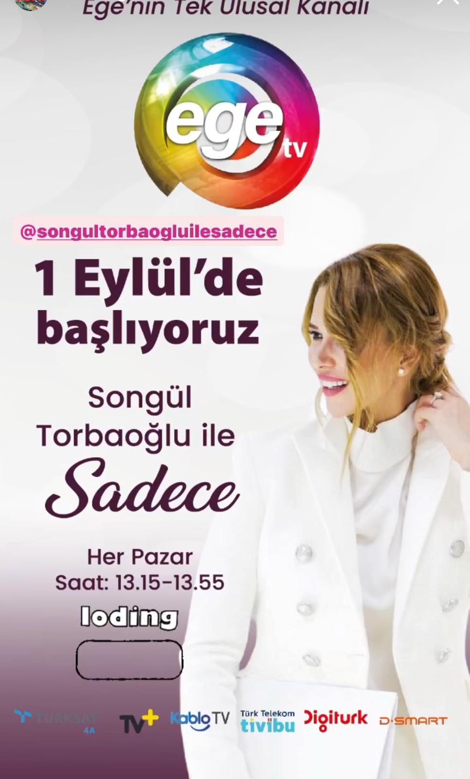 Ege TV, izleyicilerini hafta sonları yepyeni bir programla buluşturuyor: “Songül Torbaoğlu ile Sadece”. Girişimcilik dünyasında başarısıyla tanınan Songül Torbaoğlu’nun sunuculuğunu yapacağı bu program, kadınların günlük yaşamlarında ilgi duydukları yaşam tarzı, sağlık, güzellik, estetik ve moda gibi birçok konuya odaklanacak. Her Pazar günü izleyicileriyle buluşacak olan bu program, kadınların yaşam kalitelerini artırmayı ve onlara ilham vermeyi amaçlıyor.